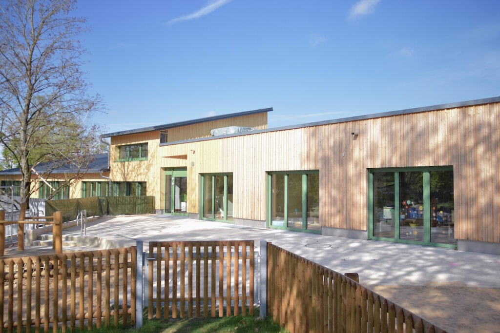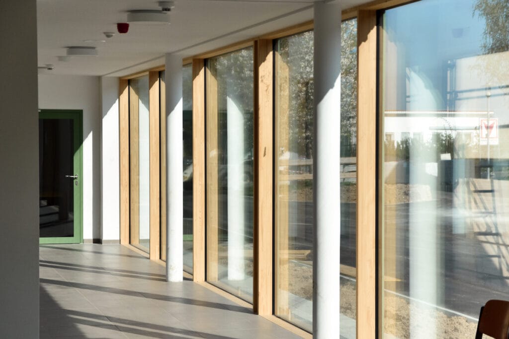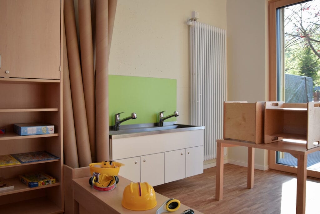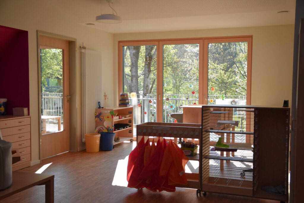Bodentiefe Fenster in den Gruppenräumen der neuen Kita holen Licht und Natur direkt ins Gebäude. Farben und Materialien spiegeln die wechselnden Blättertöne wider und schaffen eine inspirierende, kindgerechte Atmosphäre. Raumaufteilung, Materialien und Beleuchtung wurden gezielt auf die Bedürfnisse der Kinder und ihrer Betreuung abgestimmt – ebenso wie die neue, gemeinschaftlich genutzte Mensa.