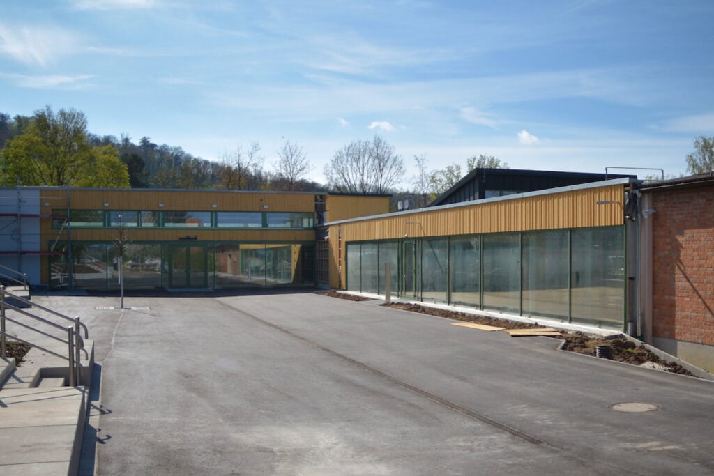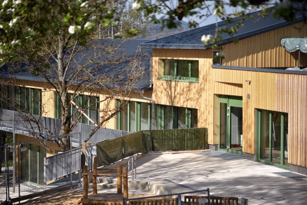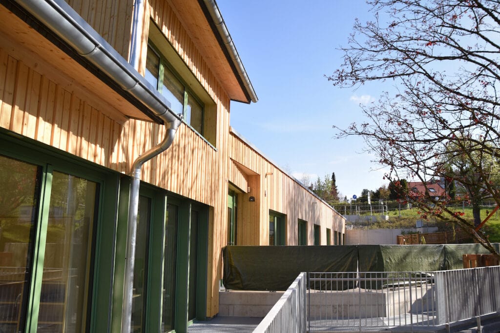 Mitten im Grünen, unterhalb des Braunenbergs, verbindet der modernisierte Bildungscampus Kita und Grundschule zu einem Ort, an dem Architektur und Pädagogik Hand in Hand gehen. Die Gestaltung der Fassade mit vertikalen Holzlamellen greift die umliegende Natur auf und schafft eine harmonische Einbindung in die Landschaft.