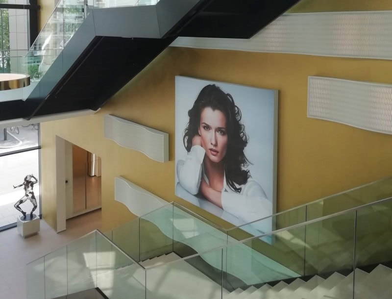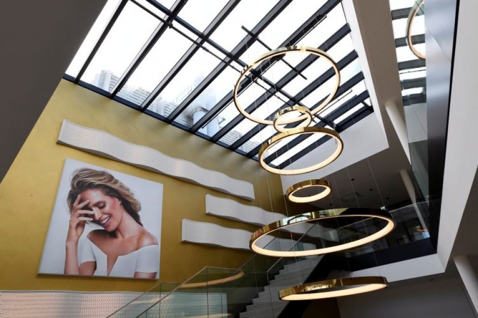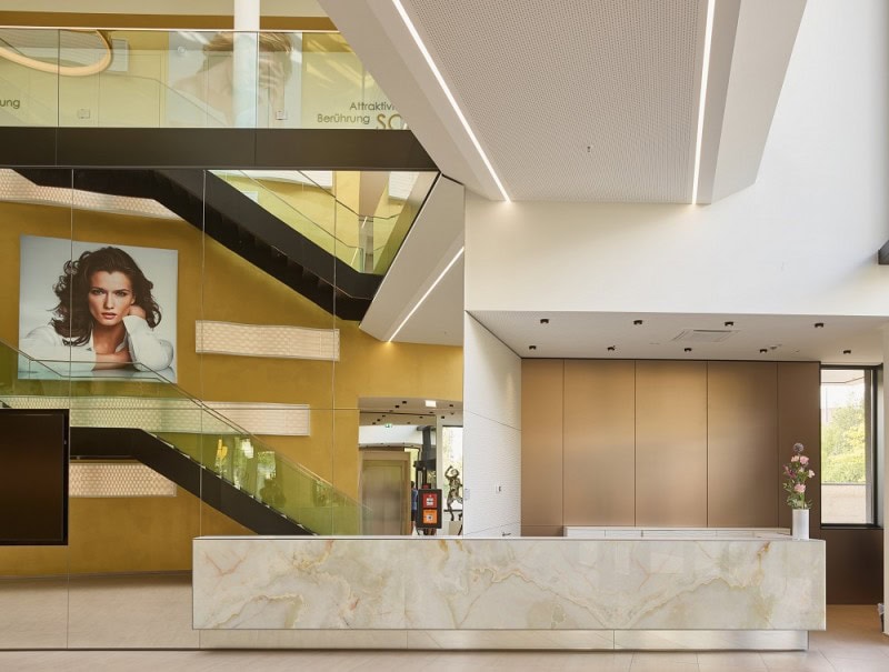 Die Gestaltung der Eingangshalle und die die Fortführung in die Bestandsgebäude sollen die Kunden in die Welt des „Schönseins“ begleiten. Der Übergang vom Neubau in das Bestandsgebäude wird zum „Beauty-Walk“ und gibt dem Besucher Einblick in die neue gläserne Produktion. Die Präsentation der gewonnenen Auszeichnungen der Firma, sowie eine weitere Markenpräsentation mit den „Markengesichter“ der Produkte sollen den Besucher durch das gesamte Werk begleiten.