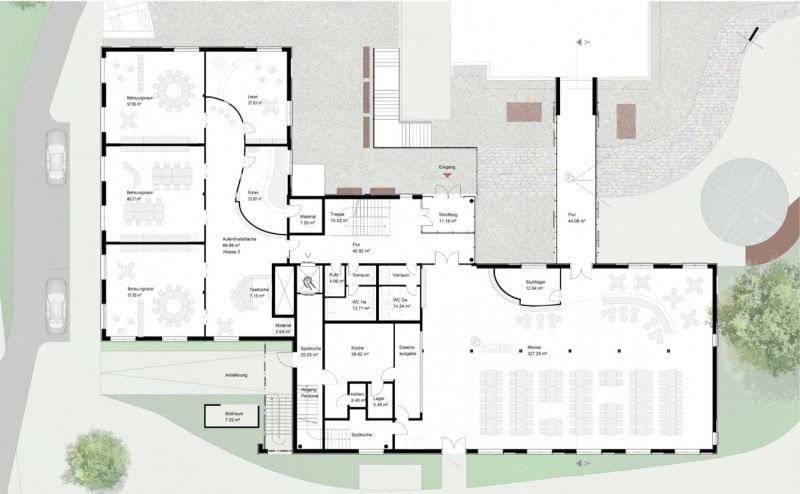 Der erhaltenswerte Baumbestand wird durch die geschickte Positionierung nahezu vollständig berücksichtigt.
