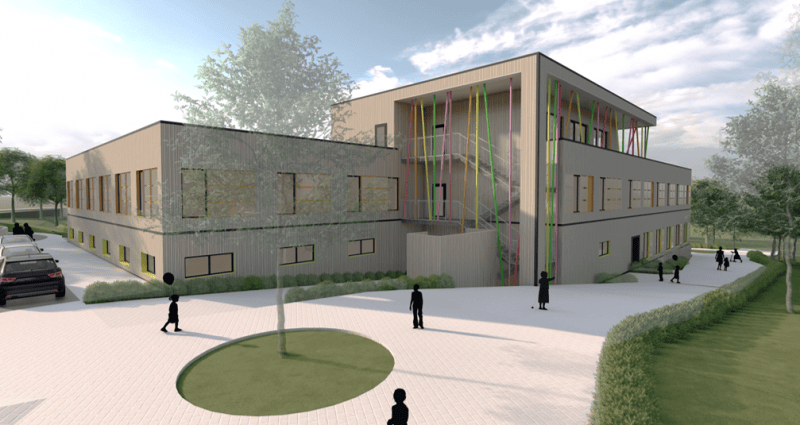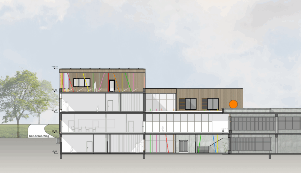 Das Erweiterungsgebäude ist als kompakter, Holzhybridbau im Effizienzhaus Plus-Standard mit extensiv begrüntem Dach konzipiert und durch die modulare Bauart ergibt sich die Möglichkeit das Gebäude mit einem hohen Vorfertigungsgrad zu errichten, was sich positiv auf die Bauzeit auswirkt.