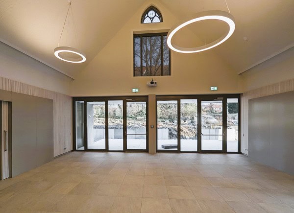 Mit großzügiger Verglasung auf der Ostseite, öffnet sich der anschließende Gemeindesaal mit seiner vorgelagerten, witterungsgeschützten Terrasse, ins Grüne und gibt sich durch sein steiles, bis zum First offenes Satteldach, die ihm zustehende Bedeutung.