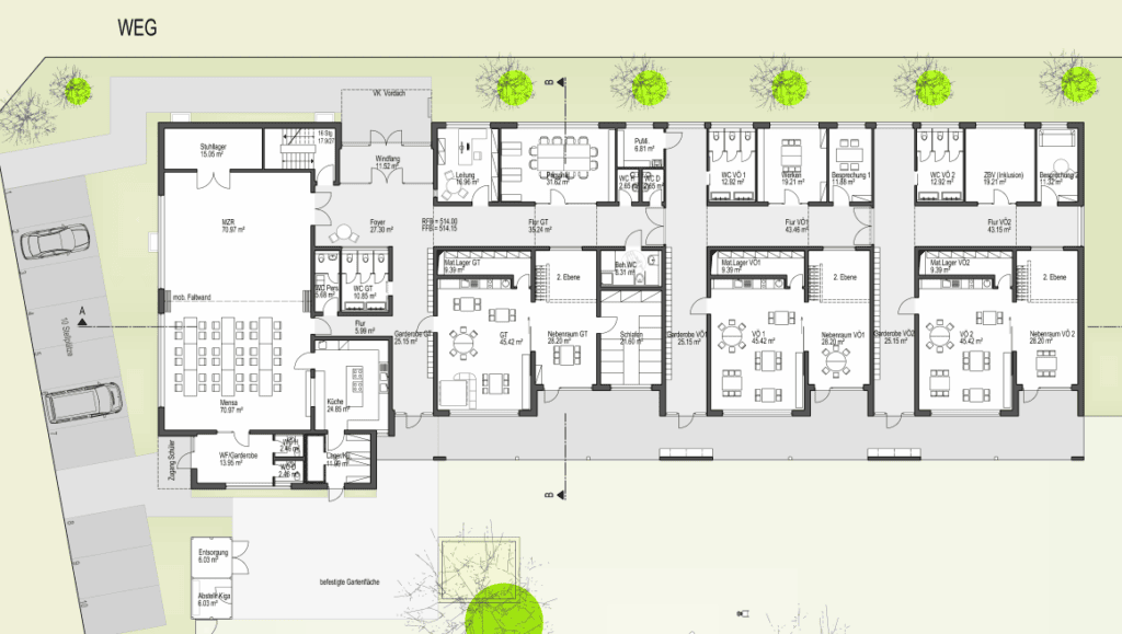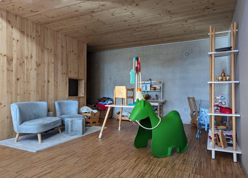 Das Raumprogramm für den Neubau der 3-gruppigen Kindertagesstätte beinhaltet einen Mehrzweckraum, Sanitärräume für die jeweiligen Gruppen, einen Schlafraum, sowie eine eigene Mensa mit Küche. Die Mensa ist ebenfalls von der Grundschule im Dorf mitgenutzt. Im Vordergrund des Raumprogrammes steht die klare Strukturierung des Baukörpers. Jede Gruppe kann als eine Ganztagesbetreuung genutzt werden.