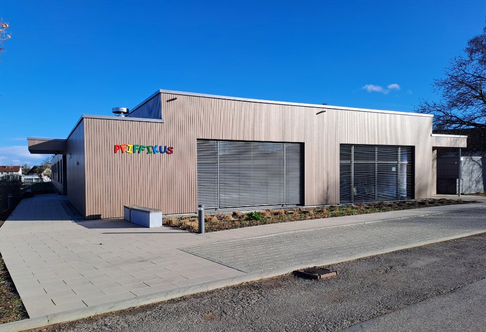 Das neue Kindergartengebäude konnte in unmittelbarer Nähe des Bestandskindergartens und gegenüber der Grundschule situiert werden. Um das langgezogene Grundstück ideal ausnützen zu können, wurden die Gruppenräume kettenförmig mit Südausrichtung angeordnet. Der Mensa- und Mehrzweckraum auf der Westseite, bildet den Kopfbau mit zwei getrennten Eingängen für Mensa und Kindergarten. Der klar strukturierte Baukörper mit seiner braun/grauen Fassade fügt sich nahtlos in die grüne Umgebung und Bebauung am Ortsrand ein.
